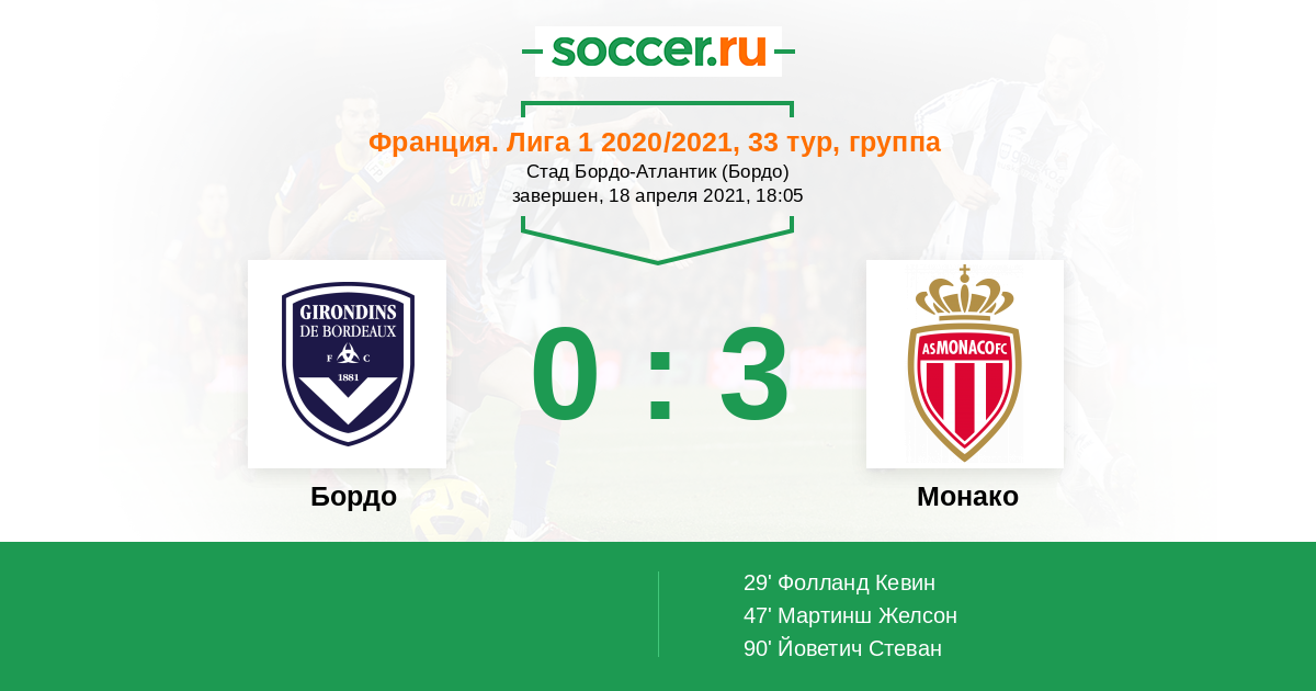 18 апреля 2021, 17:31, в тридцать третьем туре чемпионата франции «монако» в гостях сражался с «бордо». Бордо осталось на 16 позиции, имея в своем активе 36 набранных очков. Лекомт, сидибе, бадиашиле, кайо энрике, марипан, головин (диоп, 67), фофана (флорентину, 83). Обзор матча (18 апреля 2021 в 18:05) бордо: Трансляция со стадиона луи ii, футбол.